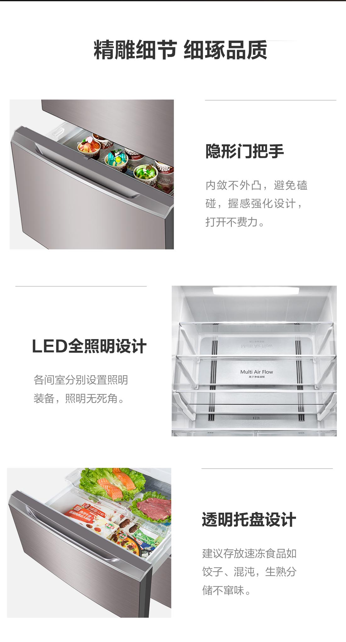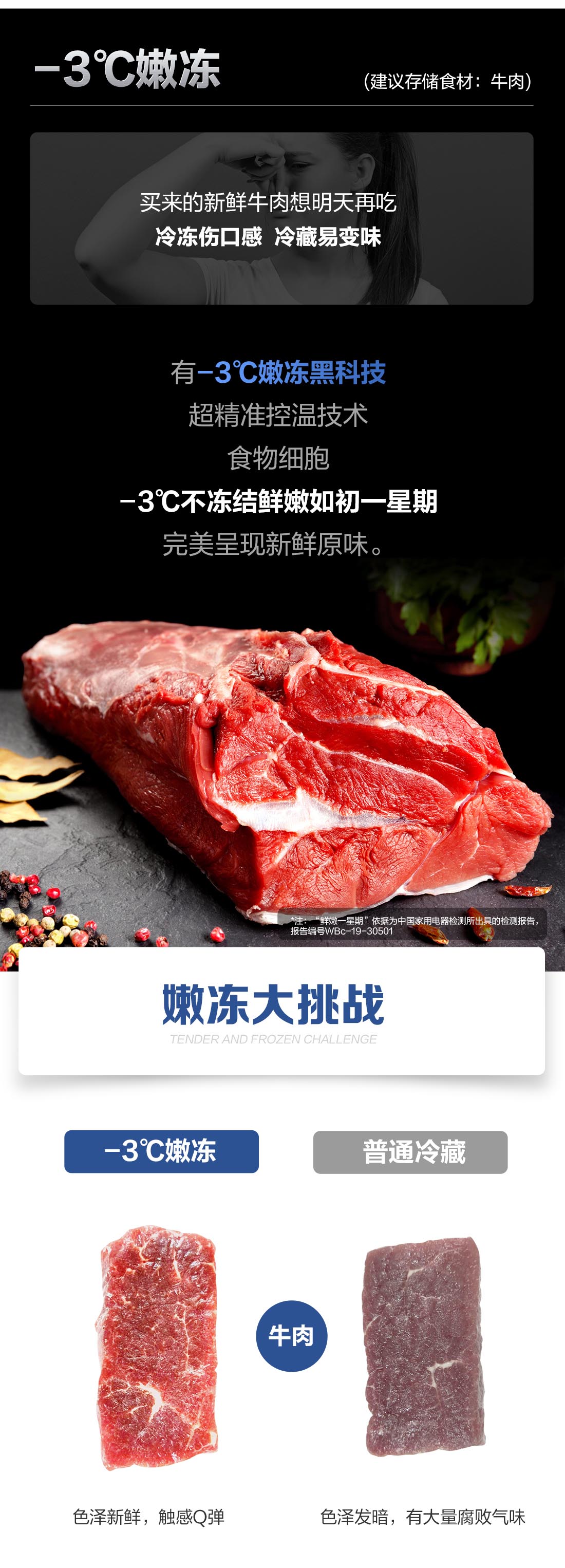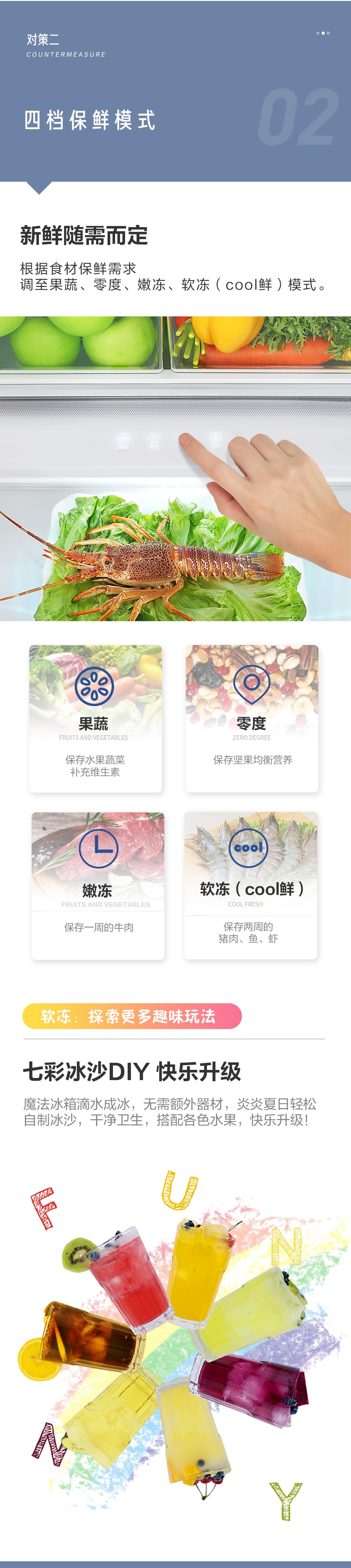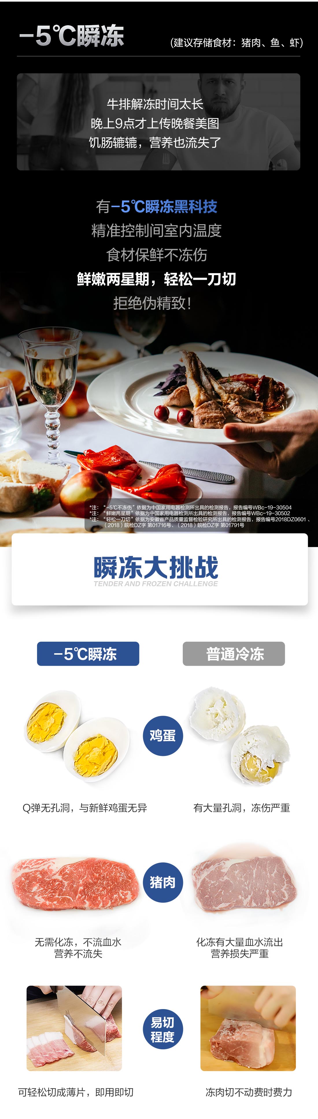 搭載-5℃瞬凍黑科技,鮮嫩兩星期,輕松一刀切。細(xì)胞級養(yǎng)鮮,營養(yǎng)流失少。搭載-3℃嫩凍黑科技,食材不結(jié)冰,鮮嫩一整周。智能全變頻技術(shù),恒溫保鮮,節(jié)能靜音。